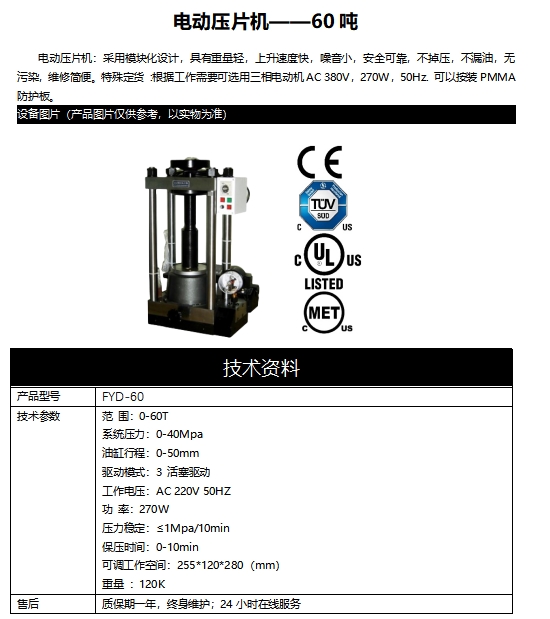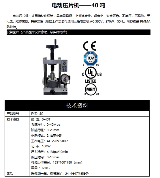 電動壓片機:采用模塊化設計,具有重量輕,上升速度快,噪音小,安全可靠,不掉壓,不漏油,無污染,維修簡便。特殊定貨 :根據工作需要可選用三相電動機AC 380V,270W,50Hz. 可以按裝PMMA防護板。