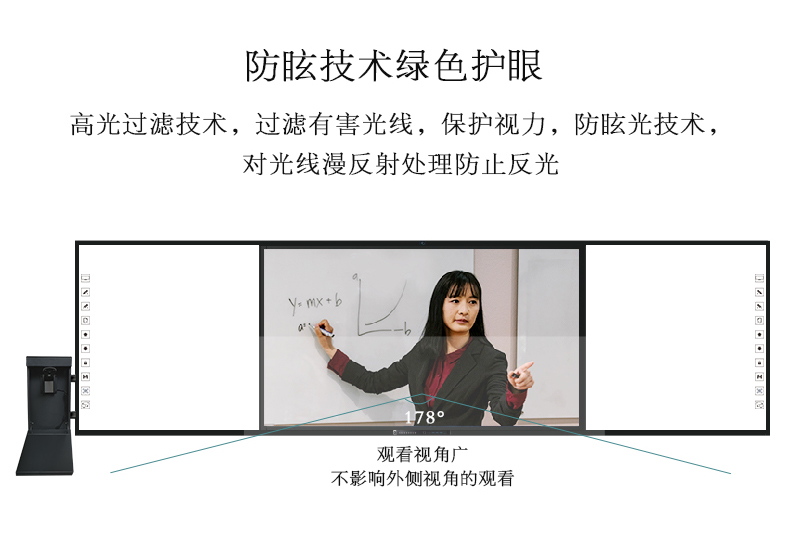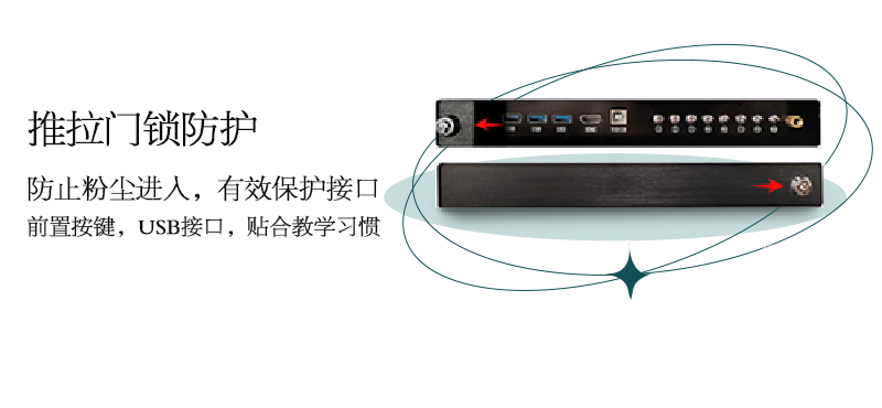 機身保護(hù)——獨特的推拉門鎖設(shè)計,保護(hù)前置按鍵及接口,還能收納白板筆和教鞭;