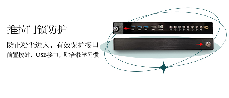 機身保護——獨特的推拉門鎖設計,保護前置按鍵及接口,還能收納白板筆和教鞭;