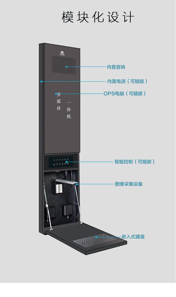 行業首家用模塊化設計理念將電腦、音箱、智能中控、圖像采集設備、鍵鼠、麥克風于一機,改變了傳統的多媒體教學設備零散模式,用小巧輕便的機身把功能集成化,是方成教學的經典之作。